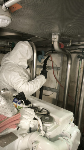 Nettoyage d’une salle des machines après chantier de rénovation sur une vedette de la gendarmerie maritime